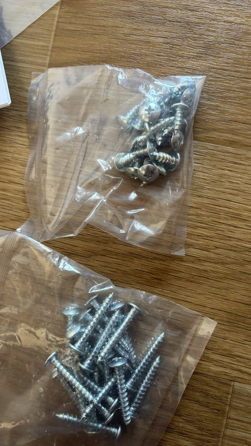 いきなり棚板5枚セット用意しろ、と。右左で固定具が違い、1枚当たり短いねじ4本、長いねじ4本をプラスドライバーでねじ込む。計40本である。